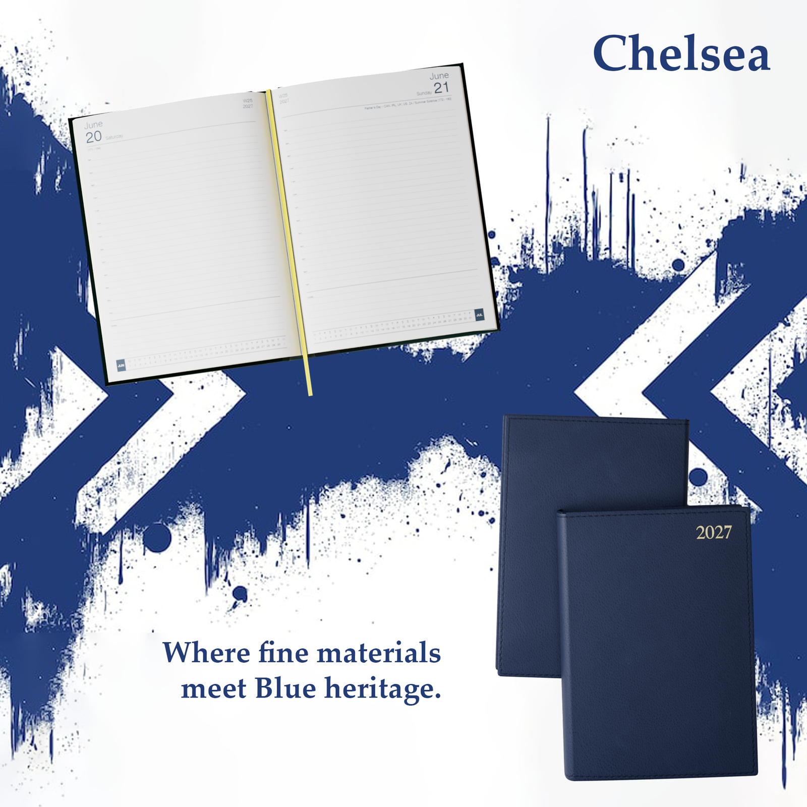 Chelsea Leather range, luxury soft grained real leather day per page layout. Smyth sewn sections for strength and durability printed on white or cream FSC paper. Self-colour cotton perimeter stitched flexible cover, ribbon marker, general information pages, forward planners, UK and international holidays, contacts directory, notes page and full colour map section