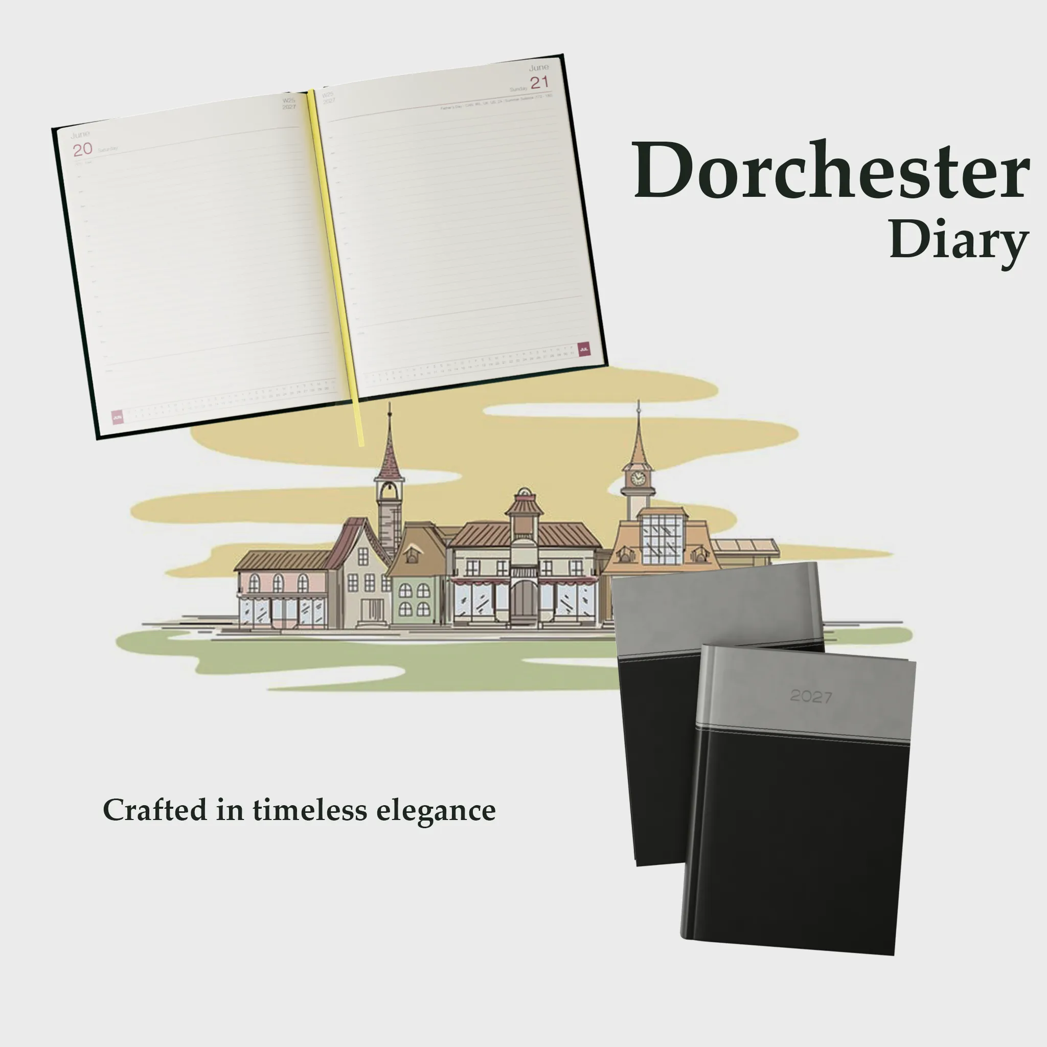 The week-to-view layout allows for clear, organized planning across two pages, providing ample space for your appointments, notes, and to-do lists. The cream-colored paper adds a refined touch, making the writing experience enjoyable and easy on the eyes. Finished with perimeter stitching and a sleek ribbon marker, this diary offers both durability and convenience. Ideal for anyone who needs a stylish yet functional planning solution, the Dorchester Bicolour A5 Diary is the perfect companion for anyone who values both form and function.