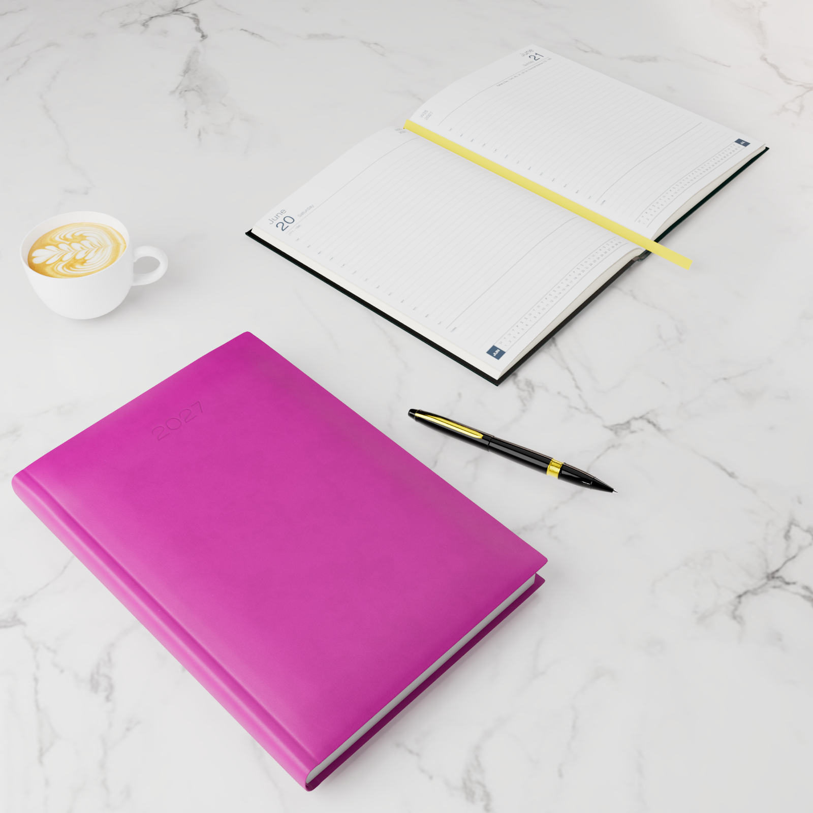 The interior features high-quality, thread-bound pages for added durability, providing a smooth writing experience across its spacious day-per-page layout. This design allows for ample space to jot down detailed plans, notes, and schedules, making it ideal for professionals, students, or anyone with a busy agenda requiring detailed organization.
